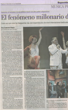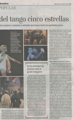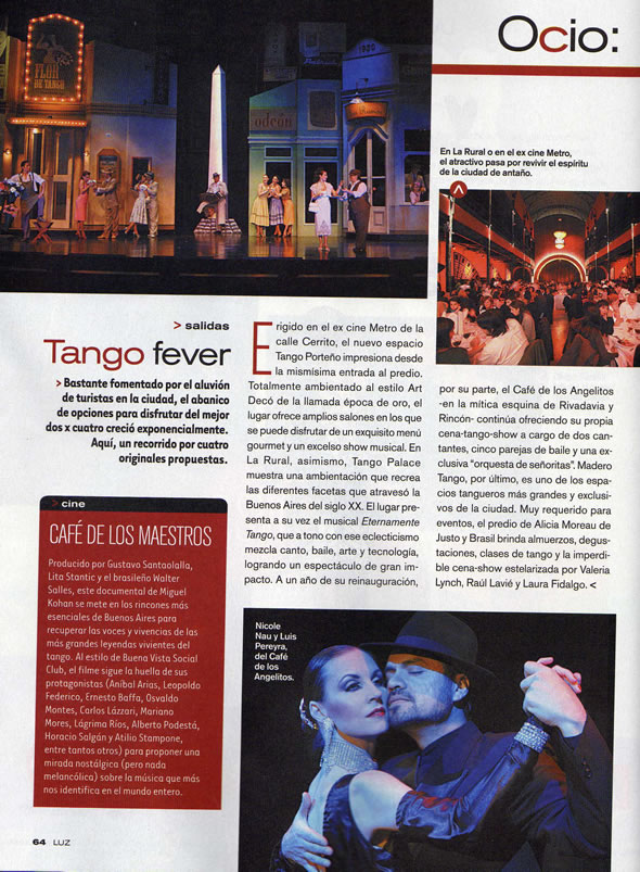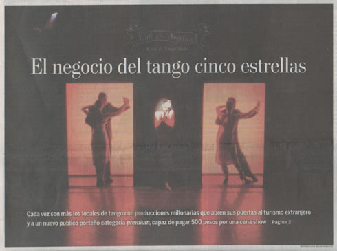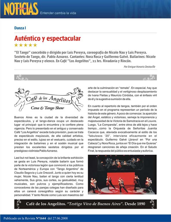 Una vez franqueado el acceso al café-teatro custodiado en las alturas por dos angelitos, el show no se hace esperar. En la apertura se asiste a exhibición de un video que relata los últimos años del Café de los Angelitos, su abandono y su renacer de las propias cenizas. Ahora estamos en un impactante salón con un enorme escenario donde se van sumando la danza, la música y la canción de Buenos Aires de todas las épocas. Con procedimientos de multimedia el telón deja lugar a las calles, a los conventillos, a los bailongos, a los salones elegantes donde el tango se fue filtrando primero tímidamente y luego con todo el fragor de su pasión incontenible. El cuerpo de baile sumamente disciplinado y los solistas Nicole Nau y Luis Pereyra ocupan el espacio en fragmentos tan conocidos y amados como "La cumparsita" y "Zorro gris" documentando con una coreografía que evoca el tango de los arrabales porteños y se concentran en el cuadro "Milongueando en el 40". El baile va apareciendo reiteradamente a lo largo de los veinticinco cuadros del show siempre bailado con unción por las parejas consustanciadas en sus trabajos estéticos y dinámicos y comandados por las estrellas de la compañía: la estupenda pareja de Nicole y Luis. Son ellos los que sacan la viruta al piso en "Mozo guapo", "Alma en pena" y "Taconeando". Por su lado el cuerpo de ballet encara decididamente desde el "Taquito militar", de Mariano Mores hasta el "Verano porteño" de Astor Piazzolla, pasando por "La Mariposa", "Boedo", "Orgullo criollo", "Papas calientes" y el famosísimo "El Choclo". Un verdadero caleidoscopio de ritmos y de estilos hábilmente equilibrados por la sagacidad de Luis Pereyra desde la dirección.