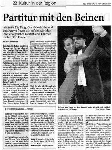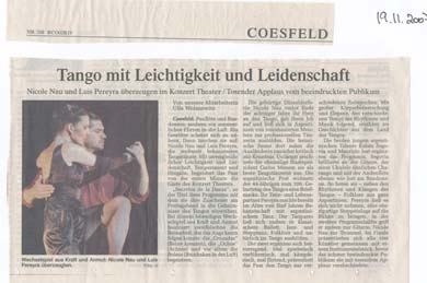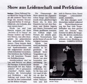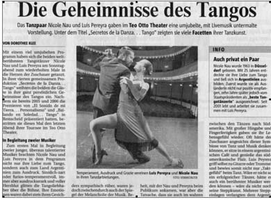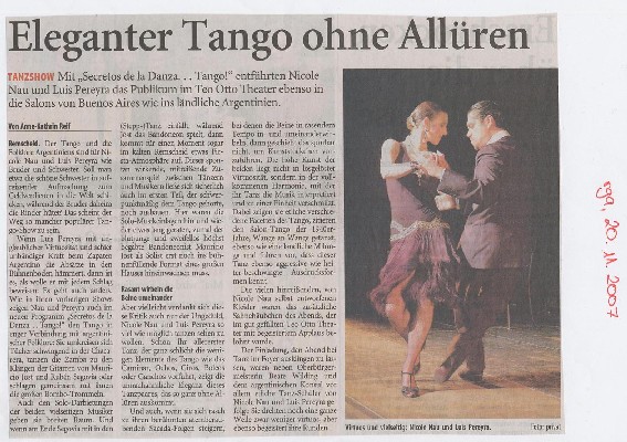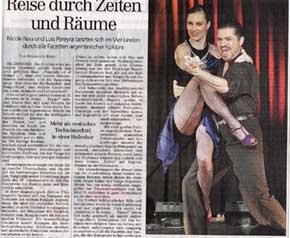 Coesfeld. Panflöte und Bandoneon zaubern ein sommerliches Flirren in die Luft. Ein Gewitter scheint sich zu nähern. Dann tauchen sie auf: Nicole Nau und Luis Pereyra, die weltweit bekanntesten Tangotänzer. Mit unvergleichlicher Leichtigkeit und Leidenschaft, Temperament und Hingabe, begeistert das Paar von der ersten Minute die Gäste des Konzert Theaters....Im Finale präsentierten sich alle vier Künstler gemeinsam mit einem Instrumentalstück, bevor das schwer beeindruckte Publikum sie mit tosendem Applaus verabschiedete. mehr
