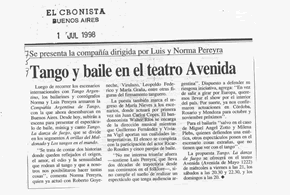 La Nacion Viernes 3 de julio de 1998 Publicado en la ed. impresa: Espectáculos Noticias | Archivo | Viernes 3 de julio de 1998 | Espectáculos | Nota Cortes y quebradas en escenaA puro dos por cuatro, "Tango, danza de fuego" se presenta en el teatro AvenidaLa danza se convirtió en el vehÃculo exportador de una música que cautivó desde los movimientos. El tango alimentó el mito pasional del otro lado lado del continente y embrujó a los europeos. Las parejas de baile se convirtieron en las estrellas de las compañÃas del tango for export . El fenómeno del espectáculo "Tango argentino", en los ochenta, fue un punto de inflexión, que desembocó en los viajes permanentes de músicos y bailarines que salieron a conquistar a otros públicos más ávidos de tango que el nuestro.