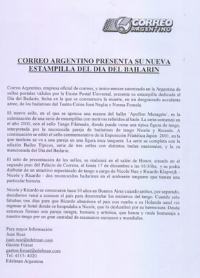 Correo Argentina presenta su nueva estampilla del Dia Del BailarÃn (Briefmarke) (Archiv 2001) |
