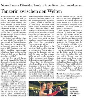 Wie kommt eine DĂŒsseldorferin auf eine argentinische Briefmarke? Ganz einfach, indem die dortige Post die typischste Tango-TĂ€nzerin des Landes auswĂ€hlt. Bis der 1963 in DĂŒsseldorf geborenen Nicole Nau im Jahr 2001 eben diese Ehre widerfuhr, hat sie einen weiten Weg voller Abzweigungen und Umleitungen zurĂŒck gelegt. WĂ€hrend sie davon erzĂ€hlt, unterstreicht sie die SĂ€tze mit weichen, ausdrucksvollen Gesten - Arme und HĂ€nde formen Figuren in die Luft. Und sie hat viel zu erzĂ€hlen. Zum Beispiel von ihrer behĂŒteten Kindheit in Oberkassel, von dem Wunsch, Ballett-Stunden zu nehmen, der nicht in ErfĂŒllung ging. Statt lernte sie reiten. SpĂ€ter wollte sie bildende KĂŒnstlern werden. Aber nach dem Abitur ĂŒberfielen sie plötzlich Zweifel: "Wie soll ich mich als freie KĂŒnstlerin ernĂ€hren". Deshalb entschied sie sich fĂŒr eine Ausbildung zur Grafikerin und stieg in einer renommierten Werbeagentur ein. "Das war die schlechteste Entscheidung, die ich treffen konnte, weil die Grafik mir die Kunst kaputt gemacht hat. Irgendetwas in mir wurde ganz unruhig".