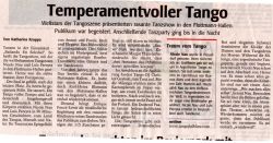 Um diese Unruhe los zu werden, belegte sie einen Jazz-Dance-Kurs. Das half nur bedingt. Schicksal spielte ein Flyer, auf dem fĂŒr die AuffĂŒhrungen des "Tango Argentino" in MĂŒnchen geworben wurde. Man schrieb das Jahr 1988. Sie fuhr in die bayerische Landeshauptstadt, guckte sich die Show an - und war augenblicklich verzaubert. Dass ein gewisser Luis Pereyra, der zur Compagnie gehörte, spĂ€ter ihr Partner werden wĂŒrde, konnte sie nun wirklich nicht ahnen. Am darauf folgenden Tag besorgte sie sich ein Ticket nach Argentinien.