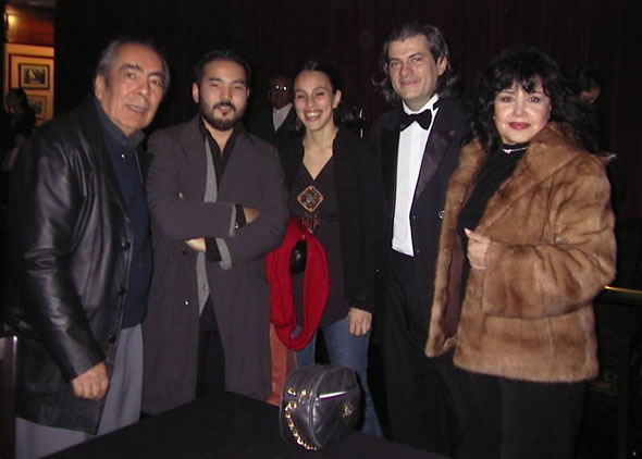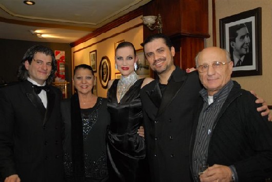 El director musical Pablo Aznarez, los directores artísticos Nicole Nau & Luis Pereyra y uno de los representantes mayores del Cafe, Don Benjamin, posan juntos a ella.