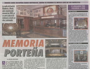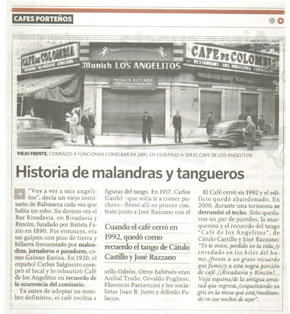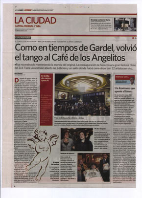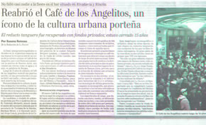 Estuvo cerrado más de 15 años Reabrió un clásico: el "Café de los Angelitos" Fue un lugar emblemático de la Buenos Aires tanguera. Carlos Gardel era un habitué de sus mesas y más cerca en el tiempo, "Pichuco" Troilo y José Ingenieros. 19.06.2007 | 20:32 El "Café de los Angelitos", uno de los más importantes emblemas de la cultura tanguera argentina y frecuentado por Carlos Gardel y otros exponentes del género, fue reinaugurado ayer con un acto y será reabierto al público hoy a las 18, tras permanecer cerrado por más de 15 años.