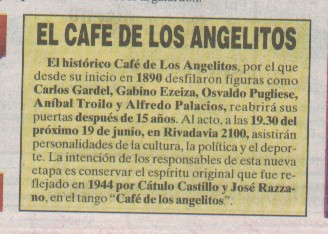 Vuelve el mÃtico "Café de los Angelitos"Cuando el 19 de junio, luego de quince años, el mÃtico "Café de los Angelitos" reabra sus puertas, la ciudad de Buenos Aires recuperará una parte de su mayor tradición cultural, un evento digno de celebración. A la misma asistirán personalidades de la cultura, la polÃtica, el deporte y los medios. |
