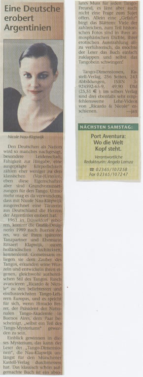 Von argentinischen Tangotänzern und -musikern, die nach Europa kamen, hat man schon oft gehört. Aber von relativ unerfahrenen Europäern, die ausgerechnet in Buenos Aires eine Tangoschule eröffnen? Und dennoch war ausgerechnet das der schwierige Weg von Ricardo und Nicole, einer Deutschen und einem Holländer, die mittlerweile zu einem international bekannten Tanzpaar avancierten. Von dieser persönlichen Geschichte lebt auch das Tangobuch von Nicole Nau-Klapwijk, von der langsamen Annäherung an eine verlockende, aber fremde Kultur und deren im Tango verkörpertem Lebensgefühl. "Yo soy el Tango!" -- "Ich bin der Tango", sagen die Argentinier etwas prahlerisch -- aber vielleicht kann man den Tango am besten bei jemandem lernen, "der ihn selbst hat lernen müssen", sagt die Autorin und Tangolehrerin. Zumindest hat man als Leser das Gefühl, sehr viel von den Nuancen und Facetten des Tango Argentino mitzubekommen: von seiner Entstehung im Buenos Aires Ende des 19. Jahrhunderts; seinen verschiedenen musikalischen und sozialen Wurzeln; den unterschiedlichen Tanzstilen, die im Tango zusammenflossen; wie er erst über den Umweg nach Europa den Ruch der Unterwelt und der Armut verlor; und warum vor zehn, fünfzehn Jahren weltweit ein neues Tangofieber ausbrach, wie man es zuvor vielleicht nur in den heißen Ballnächten im Berlin und Paris der 20er Jahre kannte. Mit "Wurzeln", "Philosophie" und "Technik" sind die drei Hauptteile des Buches überschrieben. Vor allem die Erfahrung der Autorin als Tänzerin kommt Tango Dimensionen zugute. So Durchdachtes, weil am eigenen Leibe Erfahrenes, in langen Jahren Ertanztes, wird man selten in einem Buch über den Tango finden. Und man scheint plötzlich die Faszination zu begreifen: Dass Technik, Sinnlichkeit und Philosophie dieses Paartanzes keinen Gegensatz bilden, sondern vielmehr eine Einheit, die gerade den Reiz ausmacht. Nicht vergessen darf man allerdings den Anteil, den die Erotik, das Mit- und Gegeneinander von Mann und Frau, am Reiz des Tango haben. Am Spiel von Blicken und Beinen, an den scheinbar klaren und konservativen Rollen von Führen und Geführtwerden. Weil Nicole und Ricardo nicht nur ein Tanzpaar sind, sondern auch ein Liebespaar, wird diesem Aspekt die gebührende Aufmerksam zuteil. Besonders für Tangotänzer -- und solche, die es werden wollen -- gibt es wohl kaum eine empfehlenswertere Einführung in die Welt des Tango und alle seine Dimensionen. -- Christian Stahl
